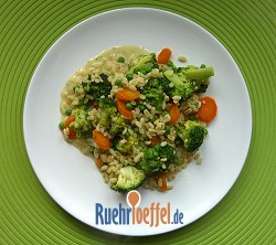 Mit Gemüsebrühe aufgießen und ca. 10 Minuten zugedeckt leicht köcheln lassen. Der Zartweizen saugt das Wasser auf. Derweil den Brokkoli in Röschen schneiden und in einem Topf mit Salzwasser 5 Minuten garen. Brokkoli abgießen und mit den Erbsen zum Zartweizen geben. Weitere 10 Minuten bei kleiner Hitze garen.